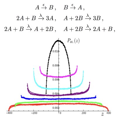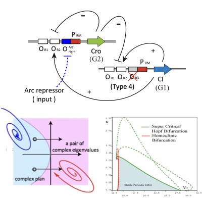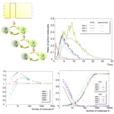 In some caces, noise and fluctuation can work as a driving force to induce tranditions in a microscopic system. Noise-induced phenomena may explain why and how biological systems can operate in an ordered manner with noisy & stochastic components. Towards this end, We have discovered a new type of noise-induced transition termed “discreteness-induced transition”, which originates from the discrete nature of inracellular reactions (Learn more).