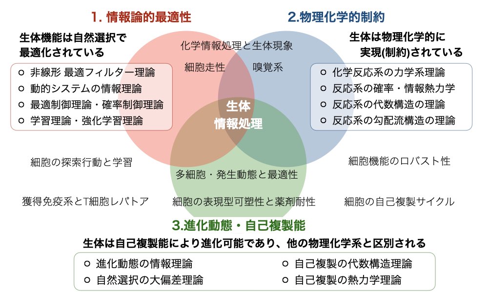 定量生物学研究室では、生命システムを他の物理系から区別する特性とその帰結としての普遍的な性質の探求を行っています。 特に我々は、情報理論や学習理論、情報熱力学を採用して、生命システムにおいて情報がどのように生成・処理・活用されるかに焦点を当て、この問題に取り組んでいます。 様々な種類の定量データを理論的・計算機的アプローチと統合することで、生命システムの原理を記述する新しい理論を確立することを目指します。 また、生命の一般原理を探索するだけでなく、得られた理論を新たな計算アルゴリズムや工学システムの設計に応用することも考えています。